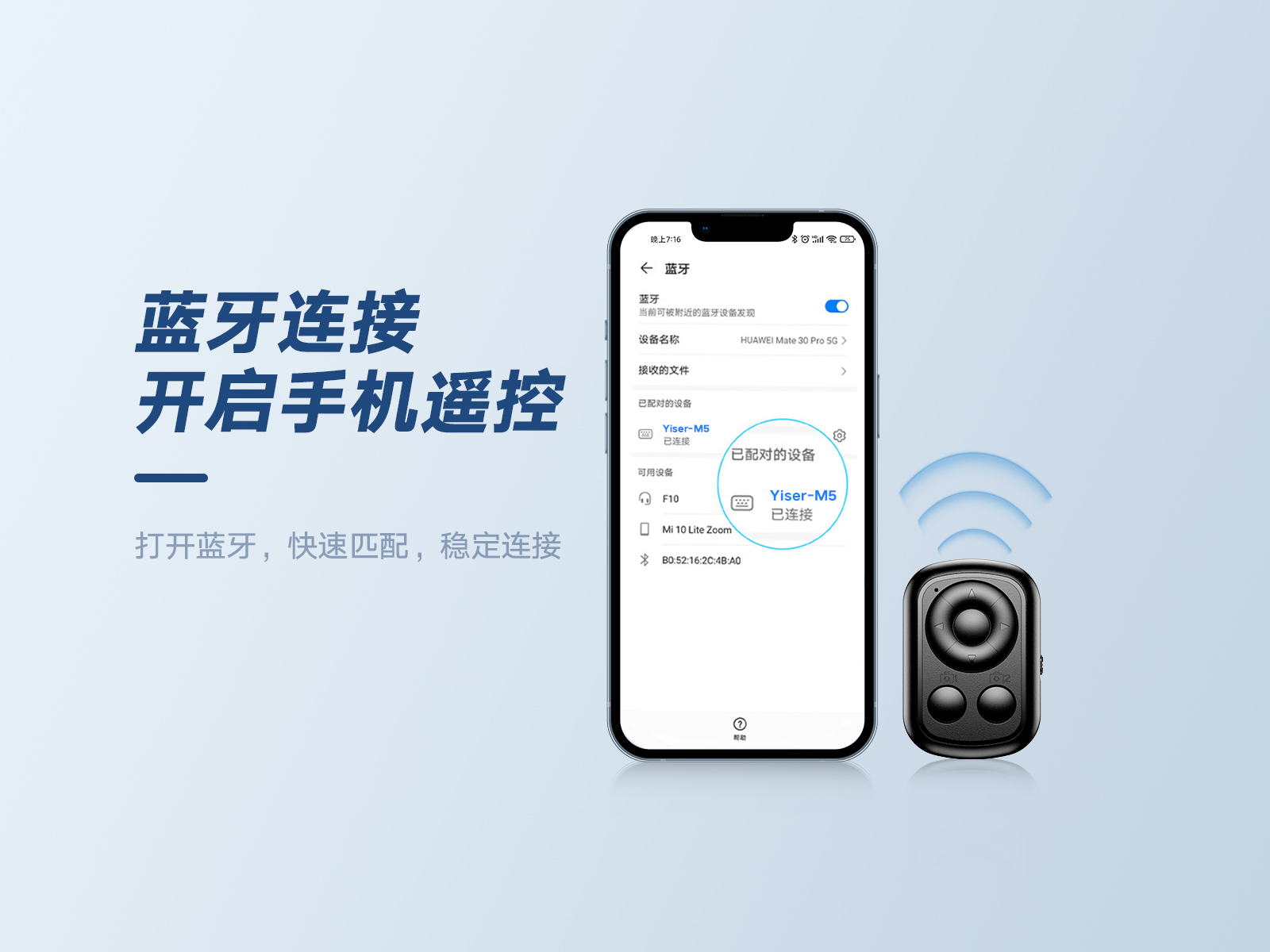 一摄科技自主研发的蓝牙指环遥控器,采用人体工学指环设计,轻至几克,佩戴舒适无感。支持主流短视频平台的翻页、点赞操作,同时具备远程自拍快门功能,是您刷视频、自拍、直播的得力助手。内置低功耗蓝牙芯片,续航持久,连接稳定。